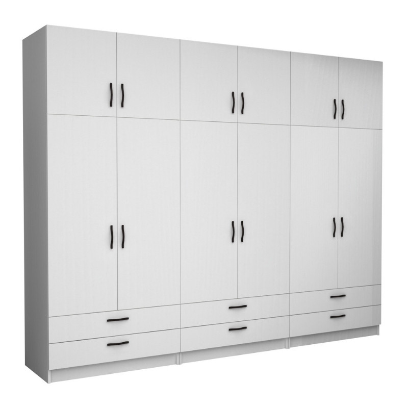 Ντουλάπα ρούχων Victoria Megapap εξάφυλλη με συρτάρια χρώμα λευκό 300x60x240εκ. Εάν ψάχνετε μια μεγάλη ντουλάπα για να τακτοποιήσετε όλα σας τα ρούχα και αξεσουάρ η ντουλάπα Victoria είναι η ιδανική επιλογή. Κλασσική γραμμή και κατασκευή από ποιοτικά υλικά με μεγάλους χώρους αποθήκευσης που την καθιστούν αναγκαία και απαραίτητη για κάθε χώρο. Τεχνικά χαρακτηριστικά: Χρώμα: λευκό Διαστάσεις ντουλάπας: Μήκος 300 x Βάθος 60 x Ύψος 240 εκ. Πάχος μελαμίνης: 18mm. Είναι κατάλληλη και για επαγγελματική χρήση (ξενοδοχεία, ξενώνες, Airbnb κλπ.) Στο εσωτερικό της φέρει τρεις μεταλλικές βέργες για κρεμάστρες για μεγαλύτερη αποθήκευση. Στο κάτω μέρος φέρει έξι πρακτικά συρόμενα συρτάρια. Τα πόμολα είναι κατασκευασμένα από πολυπροπυλένιο άριστης ποιότητας σε μαύρο χρώμα. Οι ντουλάπες μπορούν να στηθούν και ανεξάρτητα, ώστε να έχετε τρεις δίφυλλες ντουλάπες. Κατασκευασμένη από μοριοσανίδα με επένδυση μελαμίνης εξαιρετικής ποιότητας και υψηλών αντοχών στη φθορά και στο χρόνο. Τα υλικά κατασκευής είναι αβλαβή για το περιβάλλον και την υγεία, δεν περιέχουν καρκινογόνες ουσίες και ακολουθούν τα ευρωπαϊκά πρότυπα ποιότητας Ε1. Η ντουλάπα αποτελείται από τρεις δίφυλλες ντουλάπες με κωδικό GP028-0121,1 και τρία δίφυλλα πατάρια με κωδικό GP028-0123,1.Παρατηρήσεις:Το προϊόν παραδίδεται αμοντάριστο στην εργοστασιακή του συσκευασία και με αναλυτικό οδηγό συναρμολόγησης.Η χρωματική απόχρωση του προϊόντος ενδέχεται να διαφέρει ελαφρώς σε σχέση με τη φωτογραφική απεικόνισή του στην οθόνη σας.