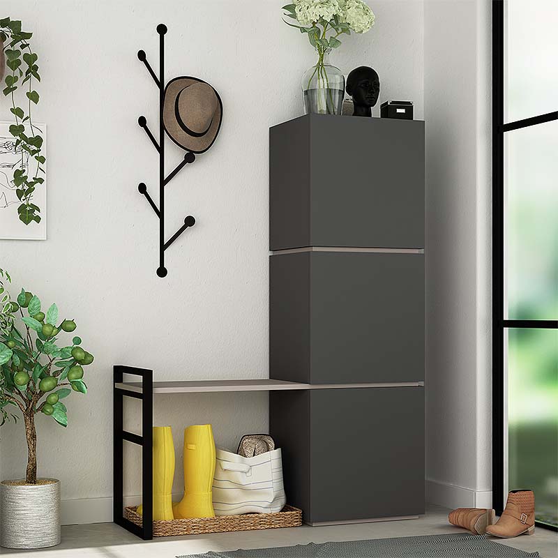 Έπιπλο εισόδου με κρεμάστρα Mello Megapap από μελαμίνη χρώμα ανθρακί 109x39x149εκ.Τεχνικά χαρακτηριστικά: Χρώμα: ανθρακί με λεπτομέρειες ανοιχτή μόκα Διαστάσεις: Μήκος 109 x Βάθος 39 x Ύψος 149 εκ. Διαστάσεις κρεμάστρας: Μήκος 22 x Βάθος 5 x Ύψος 94 εκ. Πάχος μελαμίνης: 18mm. Κατασκευασμένο από μελαμίνη εξαιρετικής ποιότητας και υψηλών αντοχών στη φθορά και στο χρόνο. Η κρεμάστρα είναι κατασκευασμένη από μέταλλο. Το μέταλλο κατασκευής δεν σκουριάζει και είναι βαμμένο με ηλεκτροστατική βαφή πούδρας. Τα υλικά κατασκευής είναι αβλαβή για το περιβάλλον και την υγεία, δεν περιέχουν καρκινογόνες ουσίες και ακολουθούν τα ευρωπαϊκά πρότυπα ποιότητας Ε1. Διαθέτει πιστοποιητικά EUTR, FSC, ISO 9001 και ISO 14001. Ιδανικό για τον οικιακό και επαγγελματικό σας χώρο.Παρατηρήσεις:Το προϊόν παραδίδεται αμοντάριστο στην εργοστασιακή του συσκευασία με αναλυτικές οδηγίες συναρμολόγησης.Η χρωματική απόχρωση του προϊόντος ενδέχεται να διαφέρει ελαφρώς σε σχέση με τη φωτογραφική απεικόνισή του στην οθόνη σας.