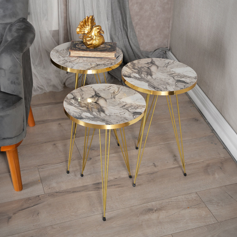Βοηθητικά τραπέζια Wakmi pakoworld σετ 3τεμ γκρι μπεζ μαρμάρου μελαμίνης-χρυσό μέταλλο