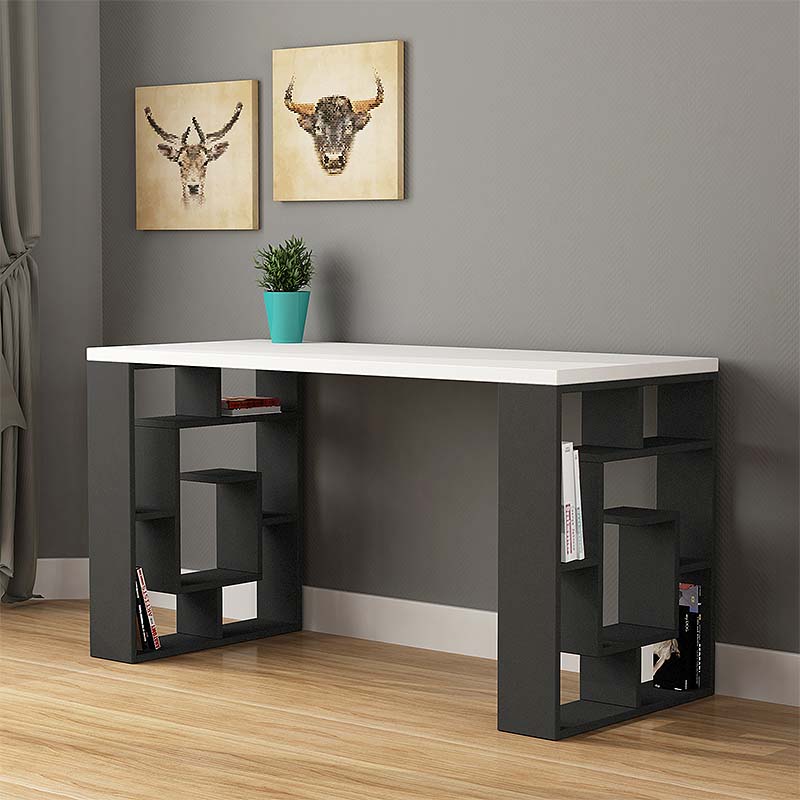 Γραφείο εργασίας Labirent Megapap από μελαμίνη χρώμα ανθρακί – λευκό 140x60x75εκΤεχνικά χαρακτηριστικά: Χρώμα: ανθρακί – λευκό  Διαστάσεις: Μήκος 140 x Βάθος 60 x Ύψος 75 εκ. Κατασκευασμένο από μελαμίνη εξαιρετικής ποιότητας και υψηλών αντοχών στη φθορά και στο χρόνο. Πάχος μελαμίνης βάσης: 18mm. Πάχος μελαμίνης επιφάνειας: 25mm. Τα πόδια του γραφείου μπορούν να χρησιμοποιηθούν και ως βιβλιοθήκη. Τα υλικά κατασκευής είναι αβλαβή για το περιβάλλον και την υγεία, δεν περιέχουν καρκινογόνες ουσίες και ακολουθούν τα ευρωπαϊκά πρότυπα ποιότητας Ε1. Διαθέτει πιστοποιητικά EUTR, FSC, ISO 9001 και ISO 14001. Ιδανικό για τον οικιακό και επαγγελματικό σας χώρο.Παρατηρήσεις:Το προϊόν παραδίδεται αμοντάριστο στην εργοστασιακή του συσκευασία και με αναλυτικό οδηγό συναρμολόγησης.Η χρωματική απόχρωση του προϊόντος ενδέχεται να διαφέρει ελαφρώς σε σχέση με τη φωτογραφική απεικόνισή του στην οθόνη σας.