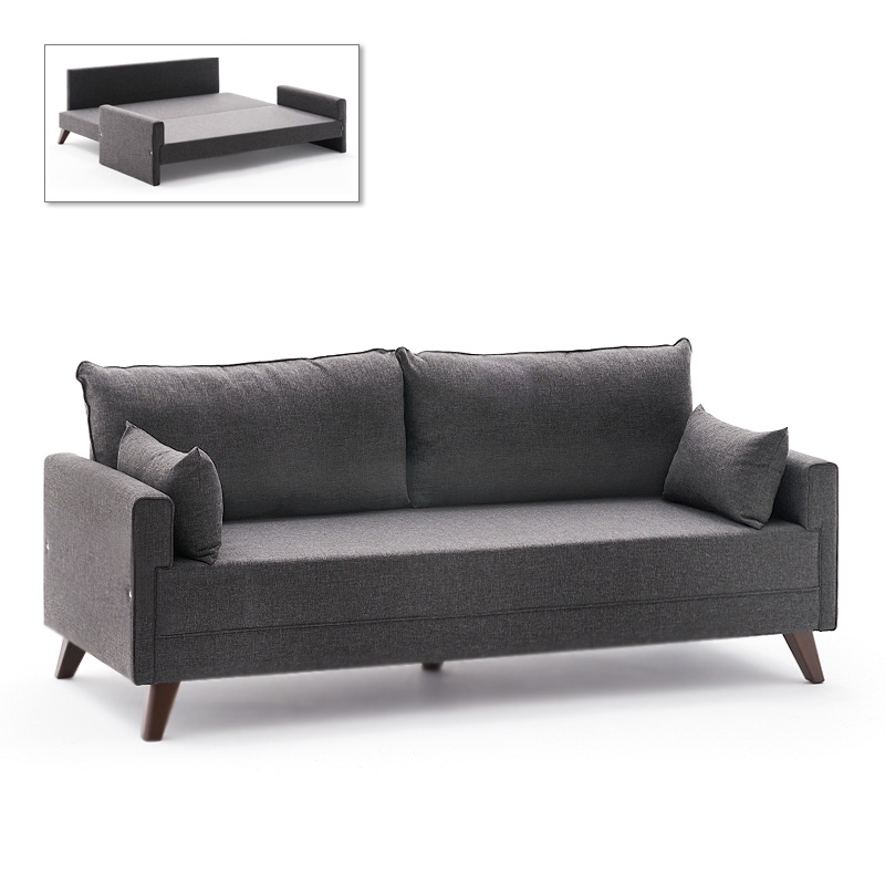 Καναπές – κρεβάτι Bella Megapap τριθέσιος υφασμάτινος χρώμα ανθρακί 208x81x85εκ.Τεχνικά χαρακτηριστικά: Χρώμα: ανθρακί Διαστάσεις: Μήκος 208 x Βάθος 81 x Ύψος 85 εκ. Διαστάσεις κρεβατιού: Μήκος 190 x Βάθος 150 εκ. Μήκος καθίσματος: 188 εκ. Βάθος καθίσματος: 53 εκ. Ύψος καθίσματος: 43 εκ. Ύψος πλάτης: 45 εκ. Ύψος ποδιών: 14 εκ. Επένδυση με ύφασμα polyester Easy Clean εξαιρετικής ποιότητας και υψηλών αντοχών στη φθορά. Το κάθισμα κατασκευάζεται με 28 DNS foam για μεγαλύτερη ανθεκτικότητα και αντοχή στο χρόνο. Εσωτερικός σκελετός κατασκευασμένος από φυσικό ξύλο ελάτης και MDF για μεγαλύτερη αντοχή στο χρόνο. Φέρει πόδια από πολυπροπυλένιο, ειδικά σχεδιασμένο για καναπέδες, με ξύλινη εμφάνιση σε καρυδί χρώμα. Ιδανικός για τον οικιακό και επαγγελματικό σας χώρο. Παρατηρήσεις:Το προϊόν παραδίδεται αμοντάριστο στην εργοστασιακή του συσκευασία.Η χρωματική απόχρωση του προϊόντος ενδέχεται να διαφέρει ελαφρώς σε σχέση με τη φωτογραφική απεικόνισή του στην οθόνη σας.