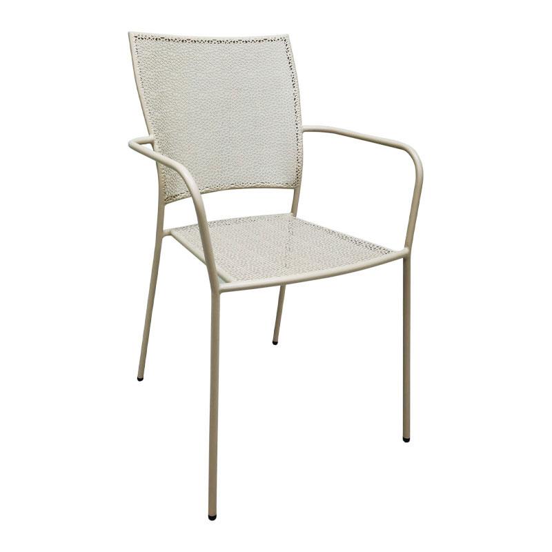 Μεταλλική καρέκλα με διάτρητο σχέδιο στην πλάτη και το κάθισμα. Σταθερός σκελετός από εξαιρετικής ποιότητας μέταλλο ηλεκτροστατικής βαφής με αντοχή στην καταπόνηση και στη φθορά από τις καιρικές συνθήκες. Με δυνατότητα στοίβαξης, κατάλληλη για εξωτερική και επαγγελματική χρήση. Για περισσότερη άνεση συνδυάστε πολύχρωμα μαξιλάρια πλάτης ή καθίσματος.
