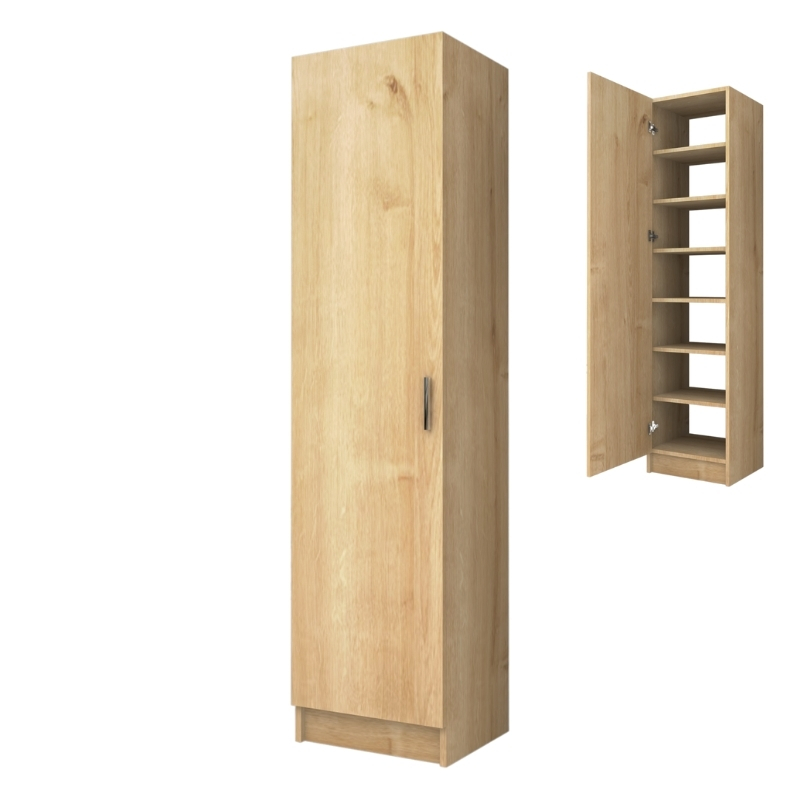 Ντουλάπα ρούχων – παπουτσοθήκη Petro Megapap μονόφυλλη χρώμα φυσικό οξιάς 45x38x180εκ.Τεχνικά χαρακτηριστικά: Χρώμα: φυσικό οξιάς Διαστάσεις: Μήκος 45 x Βάθος 38 x Ύψος 180 εκ. Πάχος μελαμίνης: 18mm. Μπορεί να χρησιμοποιηθεί είτε ως ντουλάπα είτε ως παπουτσοθήκη χωρητικότητας περίπου 14 ζευγών. Κατασκευασμένη από μοριοσανίδα με επένδυση μελαμίνης εξαιρετικής ποιότητας και υψηλών αντοχών στη φθορά και στο χρόνο. Τα υλικά κατασκευής είναι αβλαβή για το περιβάλλον και την υγεία, δεν περιέχουν καρκινογόνες ουσίες και ακολουθούν τα ευρωπαϊκά πρότυπα ποιότητας Ε1. Ιδανική για τον οικιακό και επαγγελματικό σας χώρο.Παρατηρήσεις:Το προϊόν παραδίδεται αμοντάριστο, σε εργοστασιακή συσκευασία και με αναλυτικό οδηγό συναρμολόγησης.Η χρωματική απόχρωση του προϊόντος ενδέχεται να διαφέρει ελαφρώς σε σχέση με την φωτογραφική απεικόνισή του στην οθόνη σας.