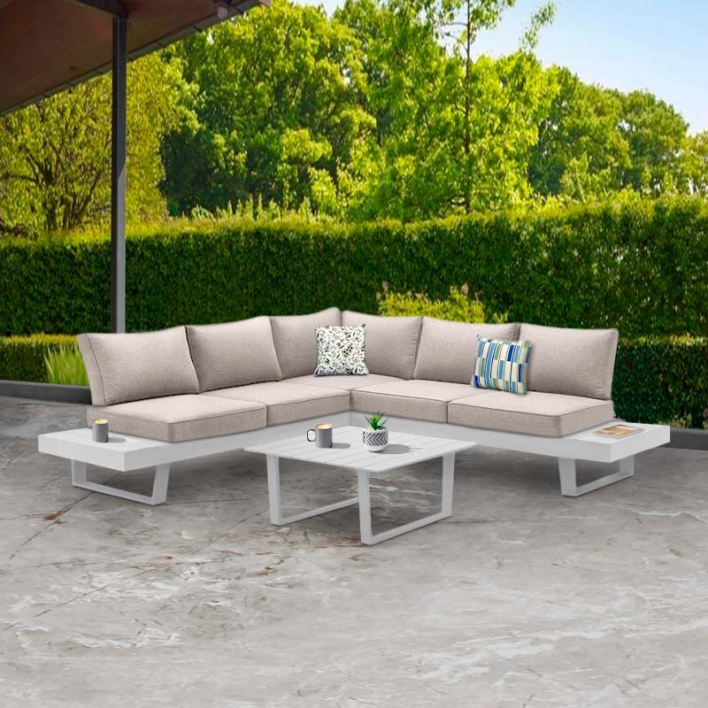 Σαλόνι κήπου γωνιακό Lyra Megapap σετ 3 τμχ μέταλλο – ξύλο χρώμα λευκόΓια όσους ψάχνουν ένα εντυπωσιακό και παράλληλα πρακτικό σαλόνι κήπου τότε το μοντέλο Lyra είναι η ιδανική επιλογή. Με το σύχρονο σχεδιασμό του θα ξεχωρίσει και θα δώσει μια πνοή ανανέωσης σε κάθε κήπο. Τεχνικά χαρακτηριστικά: Χρώμα: λευκό, μαξιλάρια χρώμα εκρού Κατασκευασμένο από ξύλο πεύκου εμποτισμού και μέταλλο εξαιρετικής ποιότητας και υψηλών αντοχών στη φθορά και στο χρόνο. Στα μαξιλάρια χρησιμοποιείται αδιάβροχο πολυεστερικό ύφασμα. Για τον καθαρισμό της επιφάνειας και την καλύτερη συντήρησή του ξύλου, χρησιμοποιούμε ένα πανί εμποτισμένο με ζεστό σαπουνόνερο και αποφεύγουμε τα ισχυρά υγρά καθαρισμού που μπορούν να βλάψουν το ξύλο. Για την καλύτερη διατήρηση του επίπλου θα πρέπει να προστατεύεται από την υγρασία και την έντονη ηλιακή ακτινοβολία. Η επιφάνειά του ξύλου έχει περαστεί με προστατευτικό βερνίκι με βάση το νερό. Το μέταλλο κατασκευής δεν σκουριάζει και είναι βαμμένο με ανθεκτική στις γρατσουνιές ηλεκτροστατική βαφή πούδρας. Ο καναπές διαθέτει έξι μαξιλάρια πλάτης και πέντε μαξιλάρια καθίσματος. Διαθέτουν φερμουάρ και αφαιρούνται τα καλύμματα. Τα μαξιλάρια κατασκευάζοναι με 22 DNS foam για μεγαλύτερη ανθεκτικότητα και αντοχή στο χρόνο. Τα διακοσμητικά μαξιλάρια δεν περιλαμβάνονται στη συσκευασία. Τα υλικά κατασκευής είναι αβλαβή για το περιβάλλον και την υγεία, δεν περιέχουν καρκινογόνες ουσίες και ακολουθούν τα ευρωπαϊκά πρότυπα ποιότητας Ε1. Είναι κατάλληλο και για επαγγελματική χρήση (ξενοδοχεία, ξενώνες, Airbnb κλπ.)Διαστάσεις: Γωνιακός καναπές: Μήκος 230 x Βάθος 230 x Ύψος 37 εκ. Ύψος καθίσματος: 47 εκ. Συνολικό βάθος: 72 εκ. Μέταλλο: 120 mm Μαξιλάρι καθίσματος: Πάχος 10 εκ. Μαξιλάρι πλάτης: Πάχος 20 εκ. Μαξιλάρια καθίσματος: Μήκος 64 x Βάθος 69 x Ύψος 10 εκ. Μαξιλάρι γωνιακό: Μήκος 67 x Βάθος 67 x Ύψος 10 εκ. Πλαϊνή ξύλινη επιφάνεια: Μήκος 27,5 x Βάθος 72 x Ύψος 37 εκ. Τραπέζι: Μήκος 72 x Βάθος 72 x Ύψος 45,5 εκ.Παρατηρήσεις:Το προϊόν παραδίδεται μερικώς συναρμολογημένο στην εργοστασιακή του συσκευασία.Η χρωματική απόχρωση του προϊόντος ενδέχεται να διαφέρει ελαφρώς σε σχέση με τη φωτογραφική απεικόνισή του στην οθόνη σας.