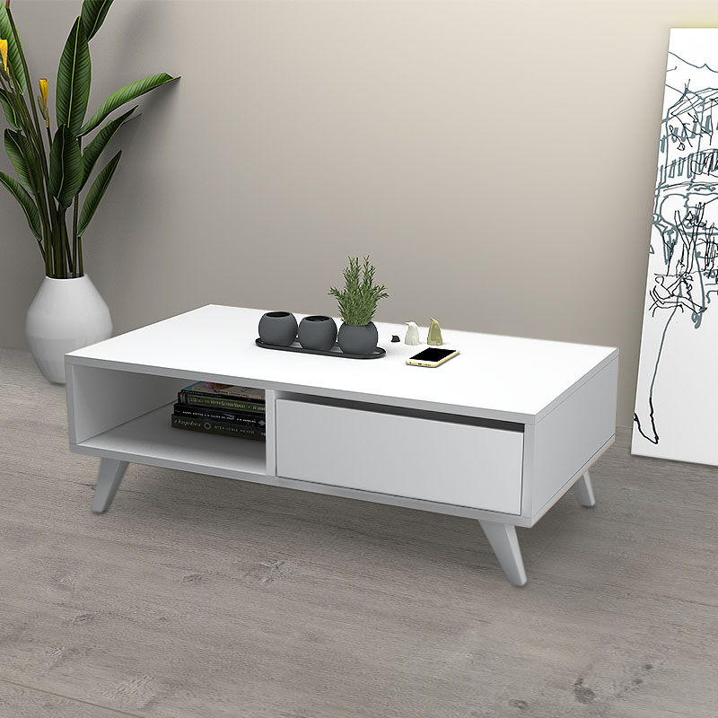 Τραπεζάκι σαλονιού Aster Megapap από μελαμίνη χρώμα λευκό 120x56x40εκ.Τεχνικά χαρακτηριστικά: Χρώμα: λευκό Διαστάσεις: Μήκος 120 x Βάθος 56 x Ύψος 40 εκ. Ύψος ποδιών: 12 εκ. Πάχος μελαμίνης: 18mm. Κατασκευασμένο από μελαμίνη εξαιρετικής ποιότητας και υψηλών αντοχών στη φθορά και στο χρόνο. Διαθέτει ένα ράφι κι ένα μικρό ανακλινόμενο ντουλάπι για αποθήκευση αντικειμένων. Τα υλικά κατασκευής είναι αβλαβή για το περιβάλλον και την υγεία, δεν περιέχουν καρκινογόνες ουσίες και ακολουθούν τα ευρωπαϊκά πρότυπα ποιότητας Ε1. Ιδανικό για τον οικιακό και επαγγελματικό σας χώρο.Παρατηρήσεις:Το προϊόν παραδίδεται αμοντάριστο στην εργοστασιακή του συσκευασία και με αναλυτικό οδηγό συναρμολόγησης.Η χρωματική απόχρωση του προϊόντος ενδέχεται να διαφέρει ελαφρώς σε σχέση με τη φωτογραφική απεικόνισή του στην οθόνη σας.