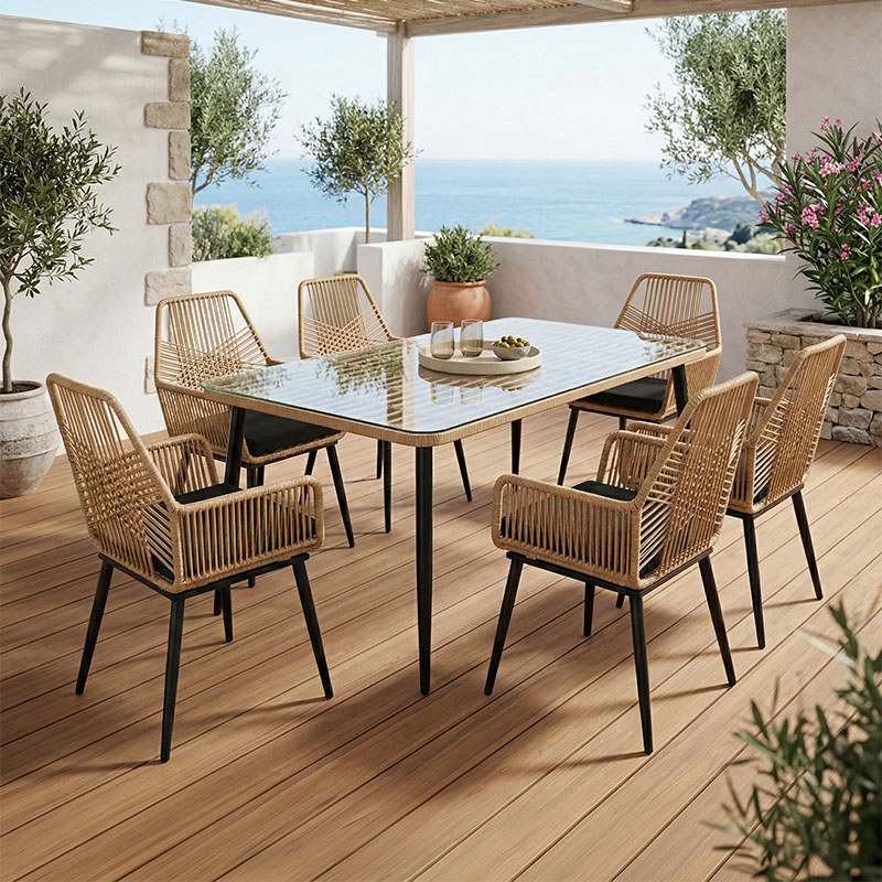 - Κυρίως επιφάνεια τραπεζιού από PE rattan. Το PE rattan είναι ένα είδος οικολογικού συνθετικού rattan, ανακυκλώσιμο και με μεγαλύτερη ανθεκτικότητα σε σχέση με τα άλλα είδη.